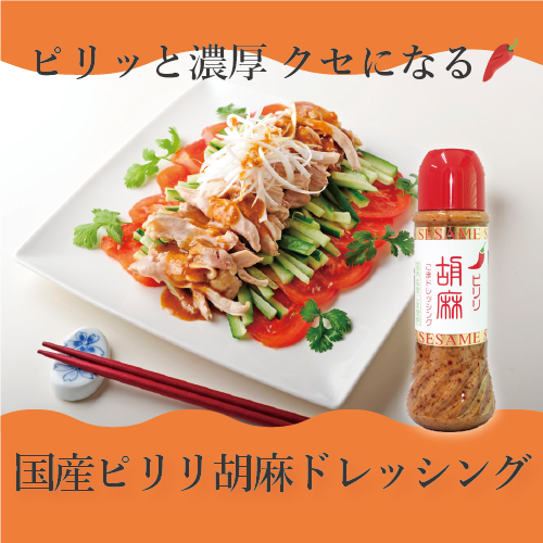 国産の金ごまを100%使用した特製ピリ辛ドレッシングです。 甘くてまろやかなごまドレッシングに、こだわりのピリ辛ラー油をあわせて作り上げました。 コクのある辛味がクセになり、一度食べたらやみつきに! リピーターの多い逸品です。