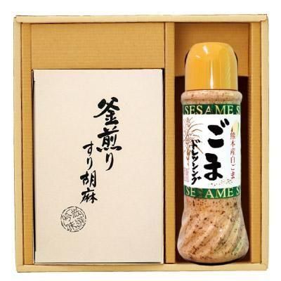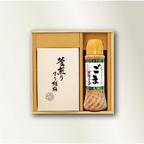 看板商品の国産白ごまドレッシングと、ごまの甘味とまろやかさが美味しい、 風味豊かなすりごま4袋入りのギフトセットです。 お中元お歳暮等のギフトはもちろん、お祝いや仏事のお返しとしても重宝されています。 釜屋特選の贅沢ギフト、大切なあの方に。
