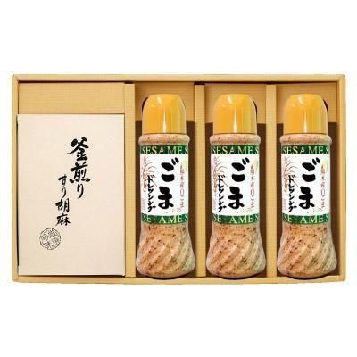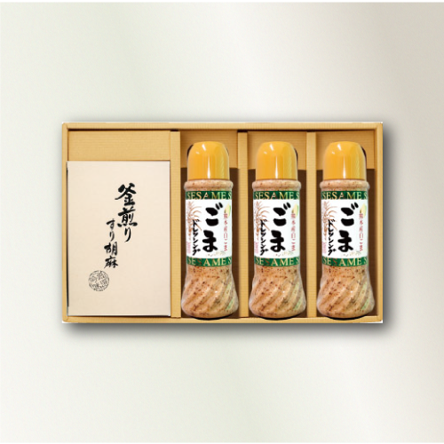 看板商品の国産白ごまドレッシング3本と、 ごまの甘味とまろやかさが美味しい、風味豊かなすりごま4袋入りのギフトセットです。 お中元お歳暮等のギフトはもちろん、お祝いや仏事のお返しとしても重宝されています。 釜屋特選の贅沢ギフト、大切なあの方に。